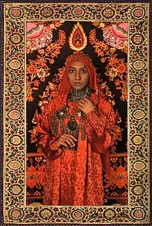 Soares used oriental references as inspiration, combined with prominent saints from India, the Middle East and Portugal to create contemporary appropriations in the series of recontextualizing saints. Her practice explored patterns of carpets in combination with sand from the dunes of Qatar, and natural dyes from India,[4] to create ephemeral Sand Carpets. The changing patterns of the carpets due to guests walking on the piece reflects her multinational identity.[5]