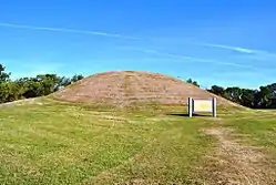 The mound covers eight acres, measuring 770 feet (230 m) by 435 feet (133 m) at the base and is 35 feet (11 m) in height.[6] Emerald Mound has a flat top with two smaller secondary mounds at each end. It was constructed around a natural hill. Travelers in the early 19th century noted a number of adjoining mounds and an encircling ditch that are no longer present. This site once had six other secondary mounds which were lost due to the plowing of the surface of the mound.[7] Emerald Mound was stabilized by the National Park Service in 1955.[1] It was declared a National Historic Landmark in 1989.[2] The mound is now managed by the Park Service's Natchez Trace Parkway unit, and is open to the public.