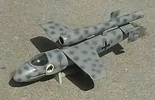 After a hurried design competition involving almost all of Germany's aircraft companies, including Zeppelin with its Fliegende Panzerfaust, Heinkel's He 162 proposal was selected as the winning Volksjäger airframe design.[4] The first prototype of the He 162 Spatz (Sparrow), flew in December 1944.[5] Other designs submitted to the Peoples' Fighter Programme, such as the Blohm & Voss P 211, were potentially superior, but never proceeded past the project stage.