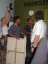 Emergency Room often converges on or operates in parallel with other formats by Thierry Geoffroy, for example Biennalist or Critical Run.[35][36] Emergency Room is a way to train the Awareness Muscle, a metaphorical muscle in Geoffroy's artistic oeuvre that compares building awareness to training a human muscle.[37] The Awareness Muscle can be trained through “Discussing politics with others on a daily basis”, which is done in Emergency Room.[32] The Delay Museum, which started as an extension of Emergency Room and has evolved independently of it, is the primary co-occurring piece and has been activated together with almost every rendition of the format.[29]