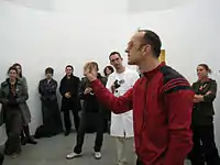 The Emergency Room events involve large numbers of native and overseas artists. By November 2008 over 450 artists had been involved in the format in a number of locations internationally.[47][19] The format has been described as "[taking] the pulse of the artistic community today"[48] and "generating endless encounters of artists with the most contemporary events, public, media and each other’s work."[49] To Thierry Geoffroy, there are artists that can be like thermometers, being able to detect dysfunctions in society[7] and identify societal impairments and reasons for alarm.[50] Emergency Room should enable an environment where art is on a more social level, the artist's role being to engage with pertinent topics that they have sensed in the social or political global climate.[7] In Emergency Room, artists are seen as the nerve of the societal body, sensitive and interconnected.[7] They are often more observant and better at communicating,[51] therefore they are optimal for tackling issues directly and spearheading debates that can circumvent unraveling emergencies.[52] The format can facilitate an artist's natural energy, working with the idea that artists are most able to create art when they have a space and a date to exhibit.[53]