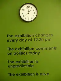 The strict time schedule of the exhibition is in place to stay as close to the present moment as possible.[1] The exhibition aims to coincide with life itself, time is unstoppable, the exhibition must keep up with it. If the exhibition can keep up with time itself, there is the possibility of art being able to provoke action.[16] Geoffroy sees the artworld as lacking the ability as only able to comment on “yesterday’s world” and Emergency Room's time based structure is an attempt to subvert this effect.[17] In this is the idea of the artist being “in time”.[18] There is a text on the outer walls of the Emergency Room structure that specifies the relationship to time and reinforces the time structure of the exhibition.[19] An analog clock hangs on this wall as well, to help artists keep to the schedule and as a reference point for museum visitors to know when the exhibition is changing or the artists will arrive.[19] Geoffroy is often quoted using the phrase "Now before it is too late", in regards to the idea that issues need to be dealt directly with as soon as possible in order to have an effect before things can't be changed.[20][21]
