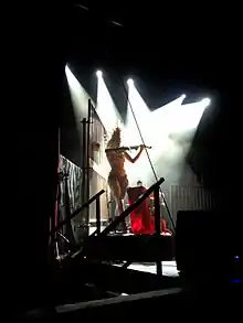 For her live performances, which she calls dinner theatre because of her practice of throwing tea and tea-time snacks off of the stage, Autumn makes use of burlesque—"a show that was mainly using humour and sexuality to make a mockery of things that were going on socially and politically"[75]—to counterbalance the more morbid topics discussed in her music, such as abuse, suicide and self-mutilation.[3] Her shows feature handmade costumes,[75] fire tricks, theatrics, and her all-female backing band, The Bloody Crumpets, a group whose members have variously included burlesque performer Veronica Varlow as The Naughty Veronica, performance artist Maggie Lally as Captain Maggot, Jill Evyn as Lady Amalthea (or Moth), actress and performer Beth Hinderliter as The Blessed Contessa, actress Aprella Godfrey Barule as Lady Aprella, German musician Lucina as Little Lucina, cellist Sarah Kim as Lady Joo Hee, German costume designer Vecona as Captain Vecona, Jesselynn Desmond as Little Miss Sugarless, and Ulorin Vex. Her intention is for the live shows to be a statement of "anti-repression" and empowerment.[29]