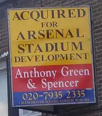 Seven months after the planning application was submitted, a poll showed that 75% of respondents (2,133 residents) were against the scheme.[31] By October 2001, the club asserted that a poll of Islington residents found that 70% were in favour,[32] and received the backing from the then Mayor of London, Ken Livingstone.[33] The club launched a campaign to aid the project in the run up to Christmas and planted the slogan "Let Arsenal support Islington" on advertising hoardings and in the backdrop of manager Arsène Wenger's press conferences.[34][35][36]