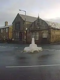 At the crossroads in the village are the remains of the market cross. Sir Thomas Fitzwilliam obtained the right to hold a weekly Thursday market and five-day May fair from King Henry II in 1253. The market cross, erected around this time, was more than three metres high. It was destroyed by Roundheads during the English Civil War and is now a stump. When Parliamentarians besieged Sandal Castle in 1645, a raiding party broke it down leaving only the stump.[30] John Turton sold his wife Mary to William Kaye of Scissett for two half crowns by the cross during Emley Feast in 1826. She returned to her lawful husband after Kaye's death.[31] At the turn of the 19th century, the stump was illuminated by a gas lamp that stood to the south. In 1961 it was hit by a lorry and was virtually destroyed. After being rebuilt by a local stonemason it was hit again by motor vehicles in 2012 and 2013, bringing about a call for its relocation.[32] The market cross is a scheduled ancient monument and is Grade II listed.[33][34]
