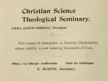 Melton writes that Hopkins' College and Seminary were "the seed organizations from which New Thought emerged."[49] Hopkins served as president of the seminary, which by 1893 had trained more than 350 students in the basic course, with over one hundred ordained to the ministry.[50] A course catalogue from that year lists Annie Rix Militz, George Edward Burnell, and Mary Lamereaux Burnell as professors.[51] Basic classes such as hermeneutics were taught by professors other than Hopkins, and the more advanced class such as Theology and Practical Ministry, were taught by Hopkins herself.[28] In 1890s, Hopkins began dispensing with the term "Christian Science", renaming her Christian Science magazine which she had founded a few years earlier the Universal Truth magazine, and renaming her student association the "Truth Students Association".[52] As Hopkins' student established their own organizations, they too would generally try to differentiate themselves from Christian Science, and just as Hopkins had made theological alterations to Eddy teachings, many of her students would make their own variations on Hopkins' original theology.[53]