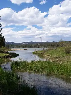 Emma Matilda Lake is located in Grand Teton National Park, in the U. S. state of Wyoming.[2] The lake is named after the wife of William O. Owen who was the first, along with three other climbers, to ascend to the summit of Grand Teton in 1898. The natural lake is 2.7 miles (4.3 km) long and can be reached by way of a 1-mile (1.6 km) hike from a parking area at Two Ocean Lake or via a slightly longer hike from Jackson Lake Lodge.[3] The 10.7-mile (17.2 km) Emma Matilda Lake Trail circles the lake and offers distant views of the Teton Range.[4]