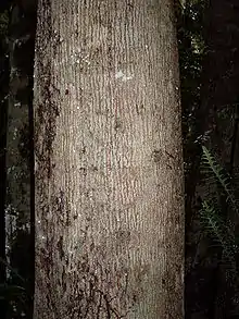 Growing to around 35 metres tall, and 150 cm (59 in) in diameter. The outer bark is fissured, silvery grey. The fissures become more evident on larger trees. The trunk is somewhat flanged at the base.