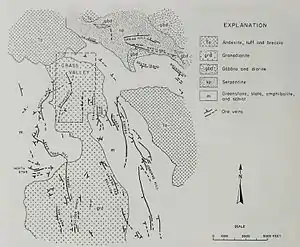 A Granodiorite body five miles (8 km) long, north to south, and up to two miles (3.2 km) wide, underlies the district. This body intruded into surrounding metamorphic rocks. Gold ore deposits reside in the quartz veins, ranging from 3 to 7 ounces per ton. The Empire Vein outcrops to the east on a north–south strike, dipping at a 35-degree angle to the west. The vein was mined with inclined shafts following dip, with horizontal shafts (drifts) every 300–400 ft (90–120 m) along strike. The ore was mined by stoping.[6]: 25 [10]: 53–59