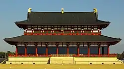 - 710 (Wadō 3, 3rd month): Empress Genmei established her official residence in Nara.[6] In the last years of the Mommu's reign, the extensive preparations for this projected move had begun; but the work could not be completed before the late-emperor's death.[11] Shortly after the nengō was changed to Wadō, an Imperial Rescript was issued concerning the establishment of a new capital at the Heijō-kyō at Nara in Yamato Province. It had been customary since ancient times for the capital to be moved with the beginning of each new reign. However, Emperor Mommu decided not to move the capital, preferring instead to stay at the Fujiwara Palace which had been established by Empress Jitō.[13] Empress Genmei's palace was named Nara-no-miya.[5]