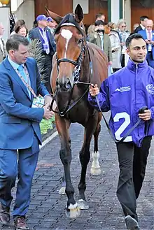 Enable was given a month's break prior to the 2018 Prix de l'Arc de Triomphe, in which she attempted to become the eighth horse, and the first trained in England, to win the race for a second time.. She started as the favourite ahead of Sea of Class, Waldgeist and Kew Gardens, while the other fifteen runners included Capri, Cloth of Stars, Talismanic, Study of Man (Prix du Jockey Club) and Clincher (Kyoto Kinen). Nelson set the pace before giving way to Capri in the straight but Enable, having tracked the leaders from the start, moved smoothly into the lead 300 metres from the finish. After looking likely to win easily she came under strong pressure in the last 100 metres but held on to win by a short neck from Sea of Class.[25] Dettori said "as we got to the false straight, the life in the old girl came back. I knew then we were in business. I waited as long as I could and, when I said 'come on, let's go', the trademark turn of foot was there... She wasn't the Enable of last year but she's got the job done".[26] John Gosden commented "It's not been the preparation we wanted, it has been very difficult, and we had a hiccup between Kempton and here with a slight temperature thing, so it has not been easy. She was not at her best today. I have had a difficult year with her, it is entirely down to the filly and her guts and a lovely ride from Frankie. She has got the job done and it is down to her mind, she is a wonderful filly".[27]