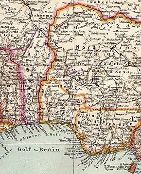 The enclaves of Forcados and Badjibo were two territories close to the river Niger, in modern Nigeria, leased to France by the United Kingdom under the Anglo-French Convention of 1898.[1][2] They were obtained by France after several expeditions along the Niger, by Hourst (1894),[3] Granderye (1898–99),[4] Toutée (1895 and 1899-1900),[5][6] and Lenfant (1901–02, etc.).[7][8] France wanted to determine whether its colonies in French Sudan could more easily be supplied upstream along the Niger rather than via the traditional Dakar route.[9]