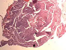 An endometrial stromal nodule is a noninfiltrative, circumscribed proliferation of endometrial stromal cells and is a benign subtype of endometrial stromal tumor. The appearance of the cells is identical to normal endometrial stromal cells. This can only be differentiated from low-grade endometrial stromal sarcoma by confirming lack of infiltration.