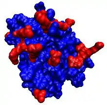 Human monomeric endostatin is a globular protein containing two disulfide bonds: Cys162−302 and Cys264−294.[11] It folds tightly, has a zinc binding domain at the N-terminus of the protein, and has a high affinity for heparin through an 11 arginine basic patch.[12][13][14] Endostatin also binds all heparan sulfate proteoglycans with low affinity.[15][16] Oligomeric endostatin (trimer or dimer) binds mainly with laminin of the basal lamina.[17]