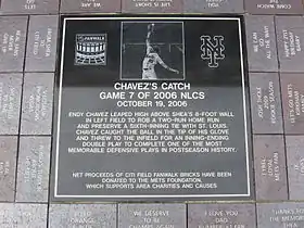 Chávez's signature moment came at Shea Stadium in Game 7 of the 2006 National League Championship Series. In the top of the sixth inning, with the game tied 1–1, Cardinals third baseman Scott Rolen hit a pitch off Mets starter Óliver Pérez. Leaping over the 8-foot-high (2.4 m) left field wall, Chávez caught the ball with the tip of his glove to rob Rolen of a two-run home run. Chávez then threw to cutoff man second baseman José Valentín, who threw to Carlos Delgado at first base to double off Cardinals center fielder Jim Edmonds for an inning-ending double play. Although the Mets would go on to lose the game and the series, "The Catch" was named the top post-season moment in the 5th annual This Year in Baseball Awards. On July 13, 2007, American International Group (the company whose left field advertisement was where Chávez made the catch) sponsored a special Bobblehead Doll day to commemorate the catch. The Left Field entrance gate of the Mets' current ballpark, Citi Field, features a metal silhouette of a baseball player making a leaping catch similar to the one Chávez made in the 2006 NLCS.