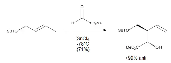 In the case of directed carbonyl-ene reactions, high levels of regio- and stereo-selectivity have been observed upon addition of a Lewis acid, which can be explained through chair-like transition states. Some of these reactions (Figure 10) can run at very low temperatures and still afford very good yields of a single regioisomer.[2]