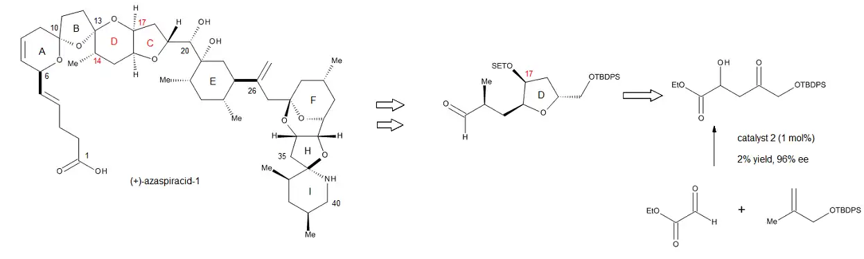 The synthetic utility of the chiral C2-symmetric Cu(II) catalysts was truly revealed in the formation of the C17 stereocenter of the CD ring fragment of (+)-azaspiracid-1, a very potent toxin (cytotoxic to mammalian cells) produced in minute quantities by multiple shellfish species including mussels, oysters, scallops, clams, and cockles.[20] As shown in Figure 19, the reaction that establishes the C17 stereocenter is catalyzed by 1 mol % Cu(II) complex 2 (Figure 15), and the authors note that it can be conducted on a 20 g scale and still give very good yields and excellent enantioselectivities. Furthermore, the product can be easily converted into the corresponding Weinreb amide, without any loss of selectivity, allowing for the facile introduction of the C14 methyl group. Thus, this novel catalytic enantioselective process developed by Evans and coworkers can be easily integrated into complex synthesis projects, particularly early on in the synthesis, when high yields and enantioselectivites are of utmost importance.