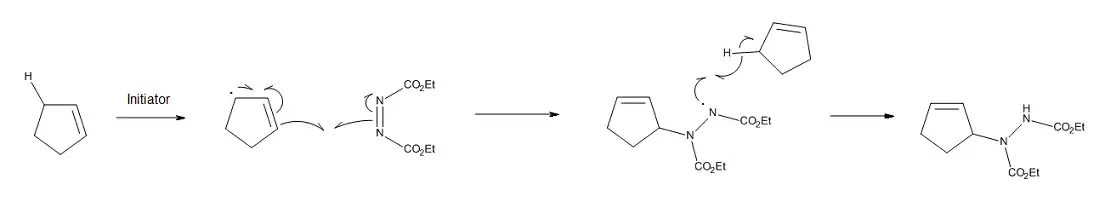 When a concerted mechanism is geometrically unfavorable, a thermal ene reaction can occur through a stepwise biradical pathway.[11] Another possibility is a free-radical process, if radical initiators are present in the reaction mixture. For example, the ene reaction of cyclopentene and cyclohexene with diethyl azodicarboxylate can be catalyzed by free-radical initiators. As seen in Figure 5, the stepwise nature of the process is favored by the stability of the cyclopentenyl or cyclohexenyl radicals, as well as the difficulty of cyclopentene and cyclohexene in achieving the optimum geometry for a concerted process.[12]
