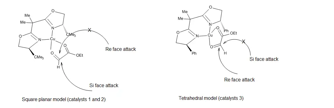 In the case of catalysts 1 and 2, it has been proposed that asymmetric induction by the catalysts results from the formation of a square-planar catalyst-glyoxylate complex (Figure 17), in which the Re face of the aldehyde is blocked by the tert-butyl substituents, thus allowing incoming olefins to attack only the Si face.[18] This model does not account however for the induction observed when catalyst 3 was employed. The current view[19] is that the geometry of the metal center becomes tetrahedral, such that the sterically shielded face of the aldehyde moiety is the Re face.