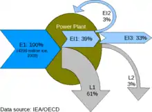 | World average fossil fuel electricity generation power plant as of 2008 [24] | Chemical to electrical | Gross output 39%, Net output 33% |