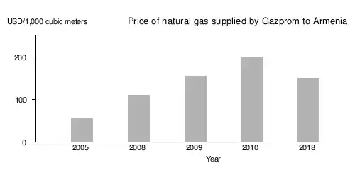 According to the agreements reached in 2017 by Karapetyan government gas import price stands at $150 for one thousand cubic meters throughout year 2018.[23] Gazprom Armenia sells it to Armenian households at almost $300.[24]