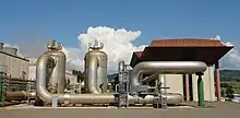 The heat produced by cogeneration plants (94%) as well as by boiler rooms (6%) and distributed by district heating represented 174 PJ in 2019, or 3.5% of the country's final energy consumption, intended for 71% to industry, 21% to the residential sector and 7% to the tertiary sector.[15] It was produced in 2020 from coal for 2.7%, oil for 12.9%, natural gas for 63.1%, biomass for 15.6%, waste for 5.3% and geothermal energy for 0.4%. Production increased by 19% between 2005 and 2020.[21] Italy's heat production reached 231 PJ in 2019, i.e. 1.5% of the world total (10th in the world).[21]