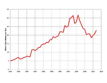 The main electricity source is hydropower, which accounts for 71% in 2004.[4] A gross theoretical capability of hydropower is 320 TWh per annum, of which 130 TWh per annum is considered as economically feasible.[9] In 2004, Venezuela produced 70 TWh of hydropower, which accounts 2.5% of world's total.[4] At the end of 2002, total installed hydroelectric generating capacity accounted 13.76 GW with additional 4.5 GW under construction and 7.4 GW of planned capacity.[9]