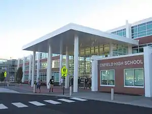 Enfield High School is a secondary school established in 1893 in Enfield, Connecticut. The Enfield High School campus is located in the Connecticut River Valley, on Enfield Street (U.S. Route 5) in Enfield's Historical District. The school has an enrollment of approximately 1400 students. The present facility was erected in 1964 on Enfield Street. The facility underwent a $6.2 million renovation and library addition completed in 2005, and a $103 million "as-new" renovation and significant expansion completed in 2017. In May 2010, Enfield High School and Enrico Fermi High School underwent a consolidation process as part of the restructuring and improvement plan of Enfield Public Schools. Enfield High School operates as the town's sole high school, which houses both students from Enfield High School and the previous Enrico Fermi High School, which closed its doors in 2016.[2]