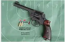 After the First World War, it was decided by the British Government that a smaller and lighter .38 calibre (9.2 mm) sidearm firing a long, heavy 200 grain (13 g) soft lead bullet would be preferable to the large Webley service revolvers using the .455 (11.6 mm) round.[1][2] While the .455 had proven to be an effective weapon for stopping enemy soldiers, the recoil of the .455 cartridge complicated marksmanship training.[3] The authorities began a search for a double-action revolver with less weight and recoil that could be quickly mastered by a minimally trained soldier,[4] with a good probability of hitting an enemy with the first shot at extremely close ranges.[5] By using a long, heavy, round-nosed lead bullet in a .38 calibre cartridge, it was found that the bullet, being minimally stabilised for its weight and calibre, tended to 'keyhole' or tumble longitudinally when striking an object, theoretically increasing wounding and stopping ability of human targets at short ranges.[6][7] At the time, the .38 calibre Smith & Wesson cartridge with 200-grain (13 g) lead bullet, known as the .38/200, was also a popular cartridge in civilian and police use (in the US, the .38/200 or 380/200 was known as the ".38 Super Police" load).[7] Consequently, the British firm of Webley & Scott tendered their Webley Mk IV revolver in .38/200 calibre.[8] Rather than adopting it, the British authorities took the design to the Government-run Royal Small Arms Factory at Enfield, and the Enfield factory came up with a revolver that was very similar to the Webley Mk IV .38, but internally slightly different. The Enfield-designed pistol was quickly accepted under the designation "Revolver, No 2 Mk I" (single/double action, with a hammer spur), and was adopted in 1931,[9] followed in 1938 by the Mk I* (lightened trigger pull, spurless hammer, double-action only),[10] and finally the Mk I** (simplified for wartime production) in 1942.[11]