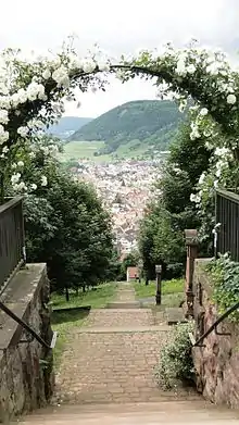 The pilgrimage way (612 steps of red sandstone, the so-called Engelsstaffeln) through the vineyards from Grossheubach features 14 Baroque chapels and 14 Stations of the Cross from 1866.[1]