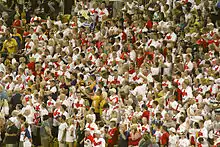 Rugby league experienced a surge in interest following the end of the Second World War. Large crowds came to be the norm for a period of around 20 years. The total crowds for the British season hit a record in 1949–50, when over 69.8 million paying customers attended all matches. The 1953–54 Challenge Cup Final replay between Halifax and Warrington, held at Odsal Stadium, Bradford, drew 102,575 paying spectators with an estimated 20,000 others getting in free after a section of fencing collapsed.[10]