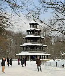 The Chinesischer Turm ("Chinese Tower") is a 25-metre-high wooden structure, first constructed in 1789 to 1790, from a design by the Mannheimer military architect Joseph Frey (1758–1819).[30] It was modelled on the "Great Pagoda" in the Royal Botanic Gardens in Kew. The Pagoda, twice as high as the tower, was supposed to resemble a porcelain pagoda in the gardens of a Chinese emperor. The Munich tower has five storeys: the ground storey roof has a diameter of 19 m, the topmost storey of 6 m.[31]
