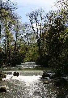 The planned location of the Munich gardens was the area north of the Schwabinger city gate, a hunting ground of the Wittelsbach rulers since the Middle Ages. Known as the Hirschanger (or "deer park"), the higher part of the hunting ground closer to the city was included in the scheme, while the Hirschau (also meaning "deer park"), lower and further north, and a more densely wooded part to the south known as the Hirschangerwald ("Deer Park Wood") were originally not included.[6] The whole area had been subject to flooding from the Isar, the river on which Munich stands, a little to the east. This problem was soon removed by the construction of a river wall in 1790, which became known as the "Riedl-Damm" after the engineer Anton von Riedl, who had supervised its construction.[7]