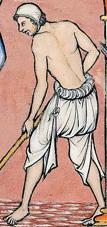 There is little evidence of footwear until the late sixth and seventh centuries.[3] Agricultural laborers shown plowing and sowing in Anglo-Saxon illustrated manuscripts work barefoot, which may indicate that footwear was not the norm until the middle Anglo-Saxon era.[4]