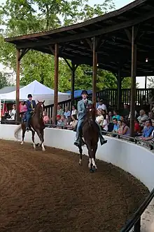 In the show hunter and hunt seat world, pleasure-type classes where the horses are not to jump are sometimes referred to as "flat" classes or "Hunter under saddle." In a variation on the pleasure class known as Hunter hack, riders may also be asked to have their horses jump two low jumps and back up. Show hack classes do not require jumping, but instead ask the horse to perform collected, regular, and extended versions of the walk, trot and canter, plus the hand gallop, usually attired in Dressage style equipment. In American Saddlebred breed competition, pleasure classes for five-gaited horses are sometimes offered, and at shows for "gaited" breeds such as the Tennessee Walker and the Missouri Fox Trotter, English pleasure classes substitute the breed's particular ambling gait for the trot.