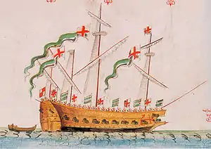 According to the royal inventory of 1547, the Antelope had a crew of 170 with 30 gunners. Her armaments included; a brass demi-cannon; 3 brass culverins; 4 iron demi-culverins; 3 sakers; 4 port pieces; 2 slings; 2 demi-slings; 2 quarter-slings; 11 iron single bases; 8 hagbuts and 4 hail-shot pieces. Handarms included 50 yew bows, 86 bills, and 72 Moorish pikes.[2] The Antelope was described in a navy list of 5 January 1548 as a "galleass" of 300 tons built in 1546 with a crew of 200 and armed with 4 brass and 40 iron guns.[3] As depicted in the Anthony Roll, she was a flush-decked vessel carrying a battery of guns on the lower deck; she carried a four-masted rig and her lower deck was pierced for nine pairs of gunports. In 1549 she was re-classed from a galleass to a 'ship'. In action against Scotland, the Antelope was one of 12 ships dispersed by a storm off Flamborough Head on Wednesday 27 December 1559. Captain Southwick brought her back to join William Winter's fleet in the Firth of Forth.[4]