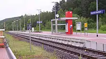 Enkenbach station[4] is the only station in Enkenbach-Alsenborn in the German state of Rhineland-Palatinate. It has two platforms tracks and is located in the network of the Verkehrsverbund Rhein-Neckar (Rhine-Neckar transport association, VRN) and belongs to fare zone 828. Its address is Bahnhofstraße 2.[5]