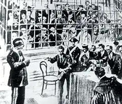 ![]() Camorra boss Enrico Alfano at the Cuocolo trial in Viterbo in 1911 | |