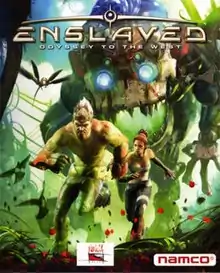 Enslaved: Odyssey to the West is an action-adventure video game developed by Ninja Theory and published by Namco Bandai Games. Announced in 2009 as Enslaved, it was released on PlayStation 3 and Xbox 360 in October 2010. As a loose adaptation of the novel Journey to the West, the game is set 150 years in a future post-apocalyptic world following a global war. Only remnants of humanity survive, along with the still active war machines left over from the conflict. The game's story follows Monkey who is forced to escort Trip home safely after they survive a ship crash. Players play as Monkey, who must combat enemies using his staff from a third-person perspective, engage in different platforming challenges and solve puzzles.