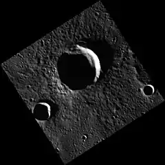 Oblique view showing Ensor (upper right) and Aristoxenus crater (bottom center)
