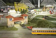EnterTRAINment Junction features a scale model of the historic Coney Island (Cincinnati, Ohio). This display is a recreation of Coney Island as it was seen in the late 1960s. This includes a working model of the famous Shooting Star roller coaster, a 4' tall Ferris Wheel, and several other rides and attractions that would have been found at Coney Island at the time. Due to space limitations some creative license was used in the layout of the model, however all of the models in the display are accurate to the period.