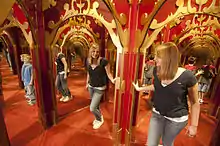 A-Maze-N Funhouse is a section of EnterTRAINment Junction that features five family-friendly mazes with different optical and physical illusions. The main midway is themed to an old-time circus. Within it are five different "tents" that all house a separate maze.[3]