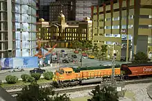 The Train Journey is the main attraction at EnterTRAINment Junction. This 25,000 square foot[2] train display is billed as the world's largest indoor train display. Over 60,000 man hours were put into this massive display that features intricate models and over 90 G-scale model trains. Each G-scale train engine is roughly a 1/24 scale of a real train engine and the nearly 1,200 box cars are approximately the size of a loaf of bread. Interactive buttons throughout the path allows viewers to control lights, sounds, and moving model pieces. The entire display is separated into three sections displaying the history of rail transport in the United States: the Early Era (1860s through the 1900s), the Middle Era (1940s through the 1950s), and the Modern Era (1970s to the present time).