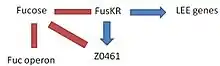 As a result, QseC phosphorylates QseB (which activates flagella), KpdE (which activates the LEE) and QseF. QseE phosphorylates QseF. The products QseBC and QseEF repress the expression of FusK and FusR. FusK and FusR are the two components of a system to repress the transcription of the LEE genes. FusK is a sensor kinase which is able to sense many sugars among which fucose. When fucose is present in the medium FusK phosphorylates FusR which represses LEE expression.