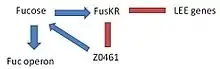 Fucose increases the activation of the FusKR system, which inhibits the z0461 gene, which controls the metabolism of fucose. This is a mechanisms that is useful to avoid the competition for fucose with other strains of E. coli which are usually more efficient at using fucose as a carbon source. High concentrations of fucose in the medium also increases the repression of the LEE genes.