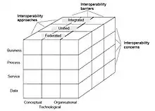 1. Interoperability concerns defined the content (or aspect) of interoperation that may take place at various levels of the enterprise. In the domain of Enterprise Interoperability, the following four interoperability concerns are identified: data, service, process, and business.[6]
