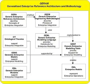 The Generalised Enterprise Reference Architecture and Methodology (GERAM) framework defined by the IFAC/IFIP Task Force provides the necessary guidance of the modelling process, see figure, and enables semantic unification of the model contents as well. The framework identifies the set of components necessary and helpful for enterprise modelling. The general concepts identified and defined in the reference architecture consist of life cycle, life history, model views among others. These concept help the user to create and maintain the process models of the operation and use them in her/his daily work. The modelling tools will support both model engineering and model use by providing an appropriate methodology and language for guiding the user and model representation, respectively.[6]