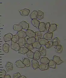 The spores are roughly spherical, with 5–7 blunt angles, and measure 7–9 by 6.5–8 µm. The basidia (spore-bearing cells in the hymenium) are four-spored, with dimensions of 30–35 by 10 µm. There are no cheilocystidia nor pleurocystidia on the gills (cystidia on the edge and face of gills, respectively). The cuticle is a trichoderm observed on not weathered specimens, or a cutis with suberect to cylindrical hyphae (5–12 µm diameter), terminal cells fusoid, membrane thin-walled, not gelatinized, with blue-brownish pigment in the cytoplasm. Clamp connections are present in the hyphae.[4]