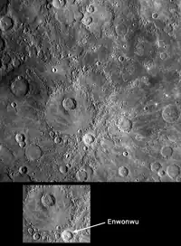 Enwonwu is an impact crater on the planet Mercury. It is named in honor of Ben Enwonwu, the modernist Nigerian sculptor and painter.[1] The crater displays a central peak and a set of bright rays emanating from the crater rim. The rays cross the surrounding surface and neighboring craters, indicating that Enwonwu crater was formed comparatively recently in Mercury's history. The brightness of the rays also suggests relative youth, as over time rays darken and disappear on Mercury's surface.[1]