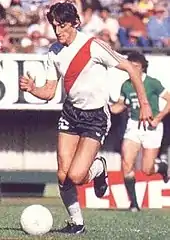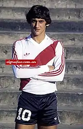 After Francescoli won the 1983 Copa América with Uruguay, River Plate signed him later that year for $310,000.[8] The following year, Francescoli was unable to show his potential, splitting time with other players. He saw more playing time towards the end of the season when the team reached the Argentine final, but was defeated 3–0 by Ferro Carril Oeste.[9] Nevertheless, Francescoli, was voted the best South American footballer of 1984 for his performances for River Plate and the Uruguay national team, featuring alongside players such as Nelson Gutiérrez and Antonio Alzamendi, among others. Eager to excel with River Plate, Francescoli rejected an offer from América de Cali (later found to be funded by the Cali Cartel) which was doing well that year and would go on to become the Copa Libertadores runners-up between 1985 and 1987.[2]
